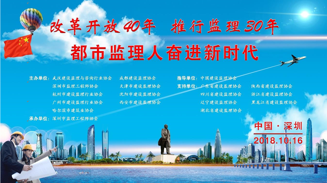 值此国家改革开放40周年,监理制度建立30周年,为讴歌改革开放,宣传监理制度,宣扬监理作用,交流各市行业成果及名优企业成长经验,激发行业改革创新动能,展示都市监理人风采,构建联合激励和联合惩戒机制,弘扬行业正气,提升行业影响,促进行业持续健康发展。武汉、成都、深圳、杭州、广州、天津、沈阳、西安、哈尔滨九市协会定于2018年10月16日在深圳联合举办庆祝国家推行监理制度30周年主题活动