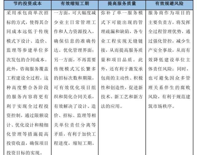实行全过程工程咨询,其高度整合的服务内容在节约投资成本的同时也有助于缩短项目工期,提高服务质量和项目品质,有效地规避了风险,这是政策导向也是行业进步的体现。