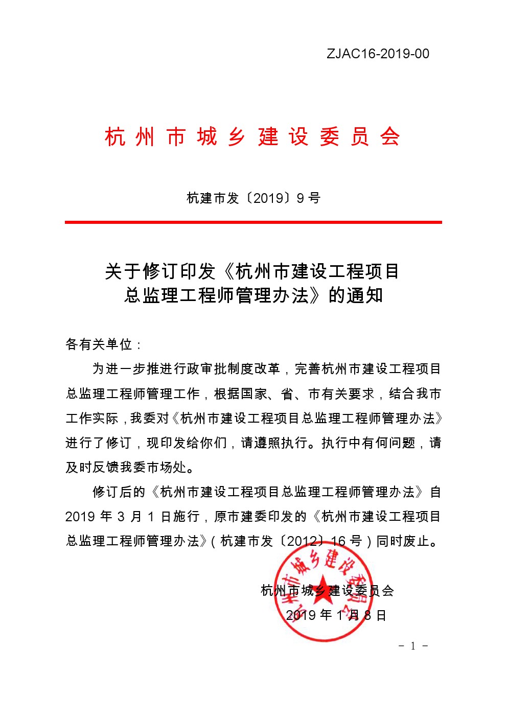 杭建市发【2019】9号 杭州市建设工程项目总监理工程师管理办法