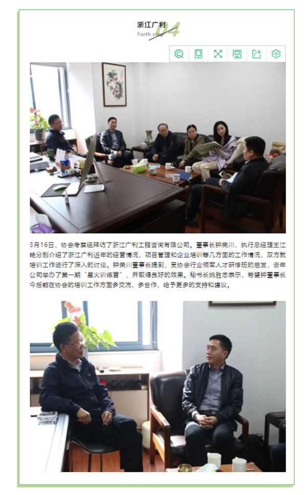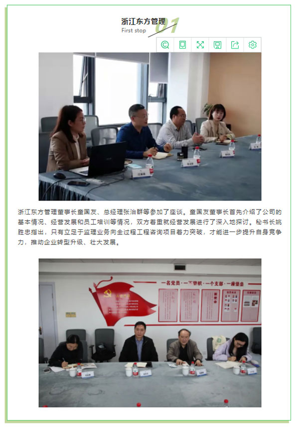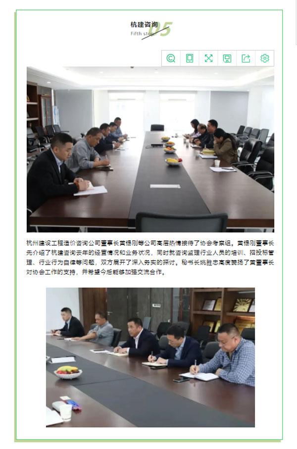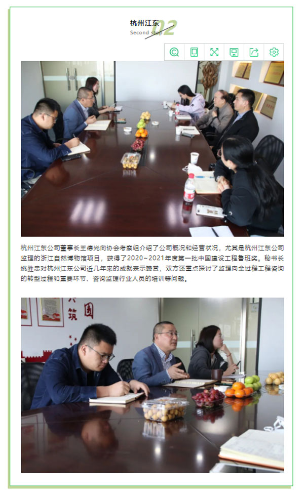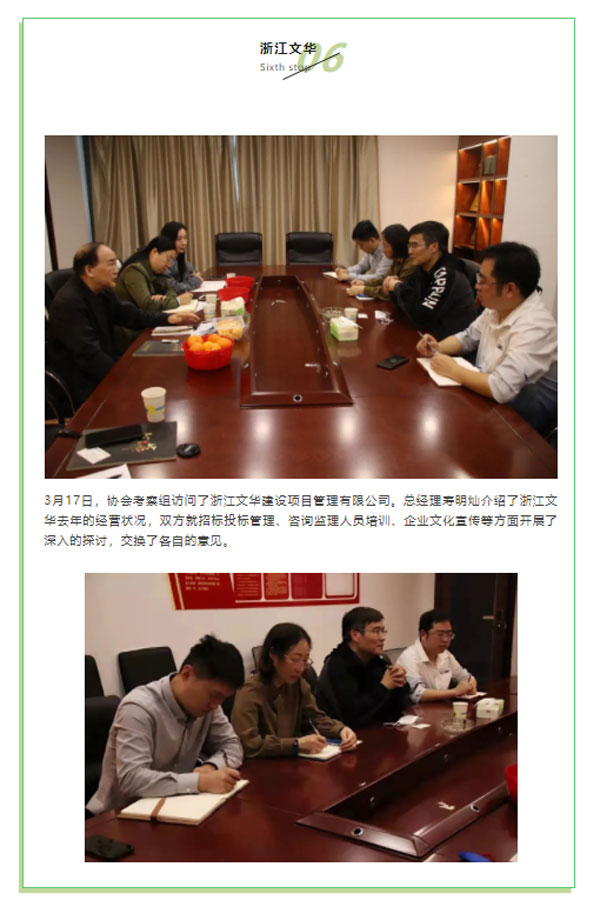 为加强与会员单位联系,调研企业转型经验,推进行业高质量发展,近日,协会秘书长姚胜忠率秘书处相关人员考察调研了浙江东方管理、杭州江东、三方建设集团、浙江广利、杭建咨询、浙江文华和政通建设共七家工程咨询、监理企业,向会员单位介绍了协会本年度的重点工作,并和企业做深入的意见交流,倾听企业诉求。