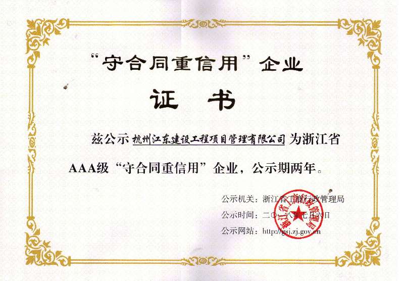 热烈祝贺本公司荣获浙江省AAA级“守合同重信用”企业信用等级